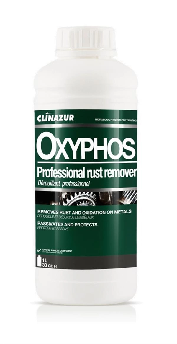 Oxyphos, günümüzde denizcilik endüstrisi temizlik ürünleri yelpazesinin bir klasiğidir. Fosforik asit bazlı formülasyonu, paslanmaz çelik pasının giderilmesine ve pasivasyona olanak tanır. İşlem görmüş metaller zaman içinde korunacak ve Oxyphos pas ve herhangi bir oksidasyon filmi oluşumunu önleyecektir.