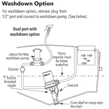 Pompada 1" (25 mm) NPT dişi giriş, 1-1/8" (29 mm) tahliye çıkışı ve güverte yıkama pompasına bağlantı için 1/2" NPT dişli port bulunur.