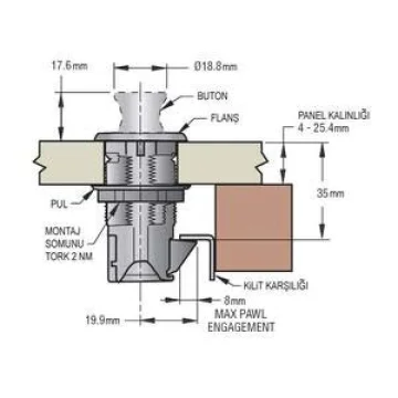 Butona basıldığında, buton gizlenerek kilitlenir, tekrar basıldığında kulp çıkar ve kilit açılır. Gövde özel plastik, buton ve çerçeve çinko üzeri kaplama, iç aksam ve yayları paslanmaz çeliktir. 4-25 mm arası panel kalınlığına uygulanabilir.