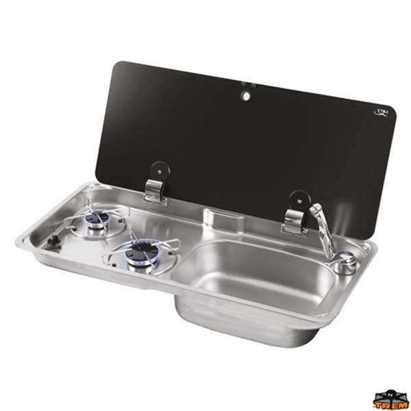 Made of stainless steel, gas supply with 2 burners, equipped with rectangular sink on the right, stainless steel support grille fixed with anti-vibration washers. Tempered black glass door with concealed hinges. Faucet and water drain must be ordered separately.
