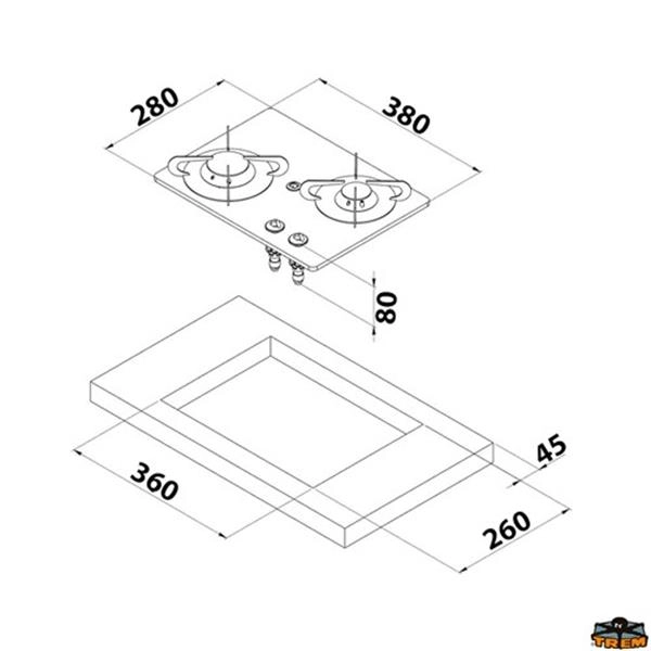recessed rectangular hob in scratch-resistant tempered glass, 2-burner gas supply with A-SR burner. there is a special sleeve at the top of the unit which is used as a seat for a column type pot holder.