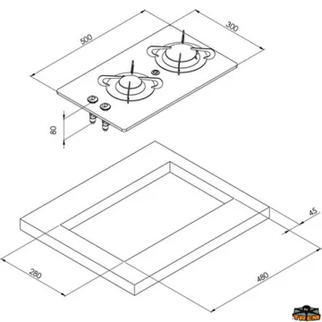 recessed rectangular hob in scratch-resistant tempered glass, 2-burner gas supply with A-SR burner. there is a special sleeve at the top of the unit which is used as a seat for a column type pot holder.