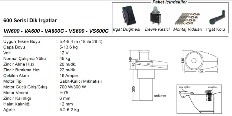 The VA 600C H. Anchor Windlass with Light is a model with an aluminum body structure and a 6 mm rope capacity.