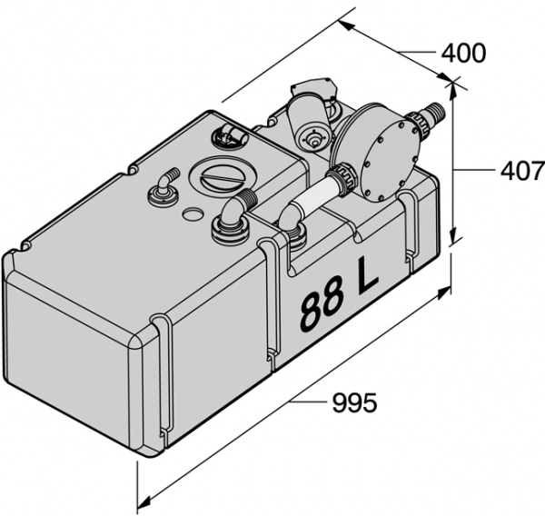 Sistem 12V bir adet pis su pompası, bakım kapağı, ultrasonik seviye şamandırası, Ø 38mm açılı çıkış, Ø 16mm açılı havalandırma çıkışından oluşur. Açılı pis su dolum dirsekleri ayrıca sipariş edilmelidir.