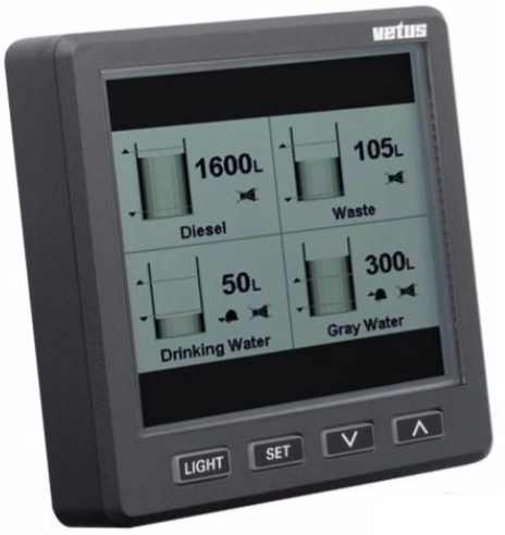 Vetus Ultrasonic Level Indicator works with RS485 Bus version and 12/24V DC power. It can measure the level of gasoline, diesel, drinking water and waste water in all kinds of non-metal tanks. It has the capacity to show the level of four different tanks at the same time on the graphic display.