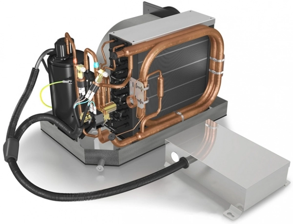 Kompresör, deniz suyu kondansesi, evaporator ve fan tek bir kompakt ünitede birleştirilmiştir. Kontrol paneli dahildir.