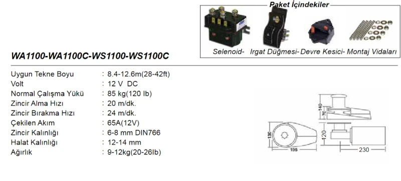 The WA1100 Vertical Windlass is equipment designed for mooring and anchoring operations on boats and yachts, operating with a 12V DC power supply. It features an aluminum body structure.