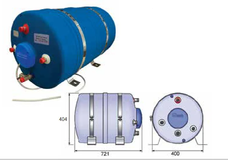 60 litre kapasiteli, 220V elektrikli ve motor devir daim suyuyla ısıtma seçeneği sunan, AISI 316 paslanmaz çelik tanklı marin boiler.