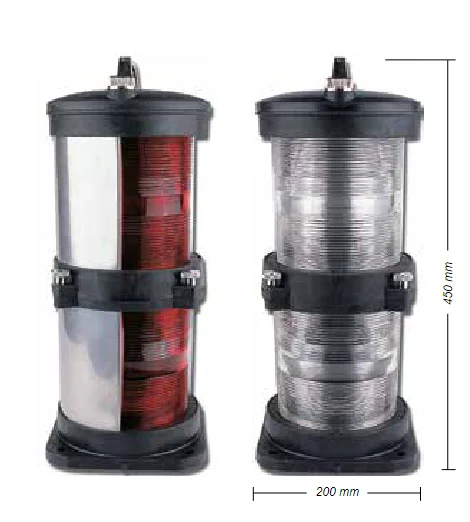 Gemi Fenerleri SL 100 Çiftli, 50 ile 100 metre arası tekneler için tasarlanmış, polikarbon-ABS gövde ve paslanmaz yanaklara sahip, TÜBİTAK onaylı ve CE belgeli seyir feneridir.