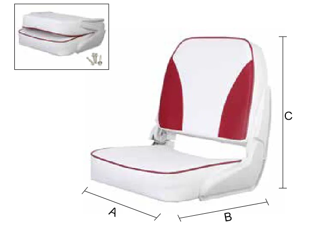 Beyaz ve kırmızı renkli, A: 45 cm, B: 36 cm, C: 48 cm ölçülerine sahip katlanır koltuk.