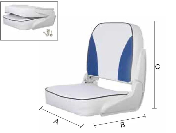 Beyaz-lacivert katlanır koltuk, A: 45 cm, B: 36 cm, C: 48 cm ölçüleriyle sunulmaktadır.