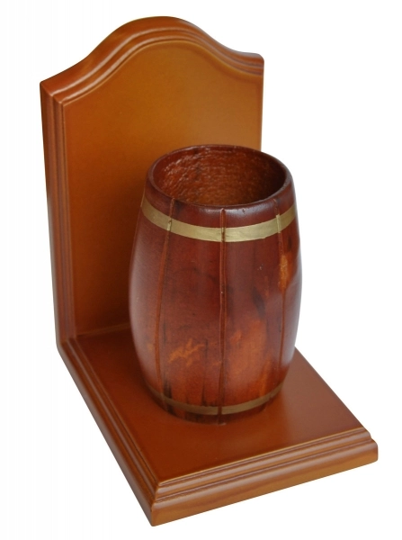 Ahşap kitap tutucu, fıçı figürlü. Kalemlik olarak da kullanılabilir. 11x14x17 cm.