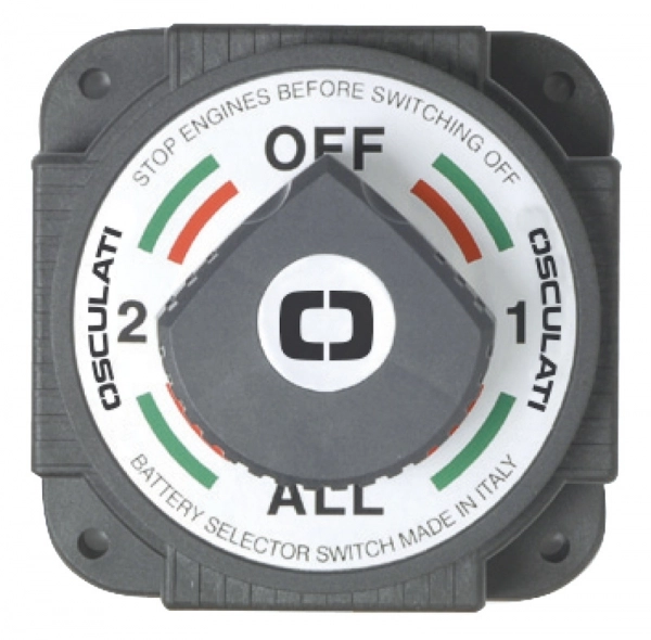 Akü şalteri, ağır hizmet tipi. Gövde polikarbonat, iç aksam bakır ve paslanmaz çeliktir. Akü şalteri, ağır hizmet tipi. Gövde polikarbonat, iç aksam bakır ve paslanmaz çeliktir. Terminaller M12´dir. 12/24V. Sürekli 380A, aralıklı 850A kapasiteye sahiptir. 130mmx130 mmx85mm h.