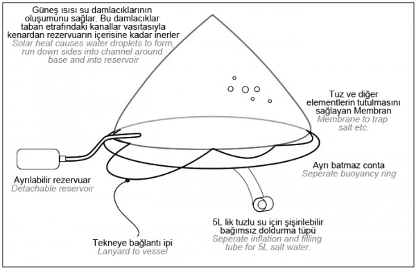 Wamblee W440 Kurtarma Cihazı Aquamate Solar Damıtıcı hafif, kompakt ve kolay kullanımlıdır. Deniz suyunu veya saf olmayan suyu güneş radyasyonundan faydalanarak damıtıp, saf içme suyuna çevirir. Damıtıcı günlük olarak 0.5-2 litre su üretir. Kırk yılı aşkın süredir dünyanın her tarafındaki askeri ve sivil organizasyonlar tarafından kullanılmaktadır. Okyanus aşırı yolculuk yapan denizciler için mekanik veya elektrikli benzerlerinin maliyetinin çok altında bir fiyatla sunulmaktadır. Paket ebadı 26x23x7 cm. Ağırlık 1075 g.