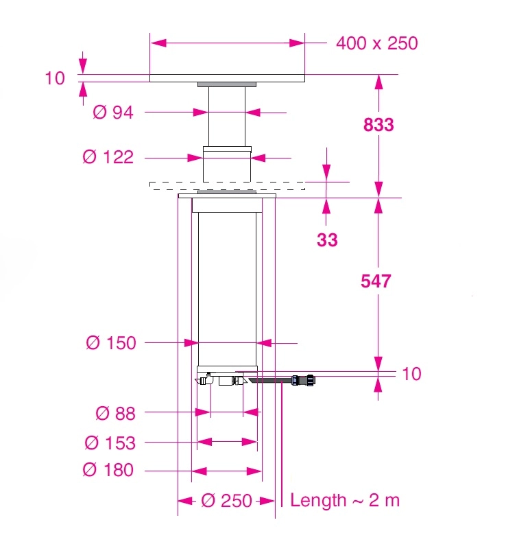Boruların geniş ölçüleri sayesinde büyük ebatlı masalar için idealdir. İki kademeli teleskopik yapı, zemin altında sınırlı bir çıkıntı elde edilmesini sağlar. Talep üzerine 12V–10A veya 24V–5A güç beslemesiyle çalışır. Elektrikli hareket istenilen herhangi bir konumda durdurulabilir. 3 konumlu anahtar ile çalıştırılır (dahil değildir): Yukarı – Aşağı – otomatik sıfıra dönüş. Anahtarın polariteyi ters çevirmesine gerek yoktur; elektrik akımı anahtar üzerinden geçmez. Ağırlık: 18 Kg.