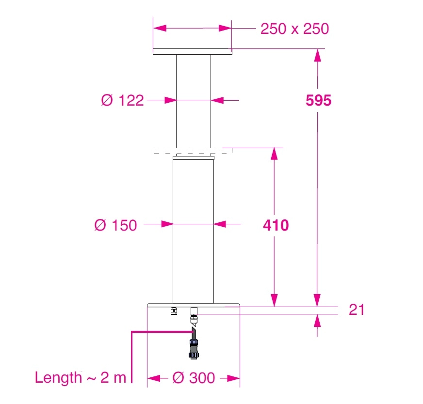 Boruların geniş ölçüleri sayesinde büyük koltuklar için idealdir. Talep üzerine 12V–12A veya 24V–6A güç beslemesiyle çalışır. Elektrikli hareket istenilen herhangi bir konumda durdurulabilir. Zeminden yalnızca güç besleme kablosu ve (dış mekân montajında) su tahliye hortumu geçirilir. 3 konumlu anahtar ile çalıştırılır (dahil değildir): Yukarı – Aşağı – otomatik sıfıra dönüş. Anahtarın polariteyi ters çevirmesine gerek yoktur; elektrik akımı anahtar üzerinden geçmez. Ağırlık: 11 Kg.