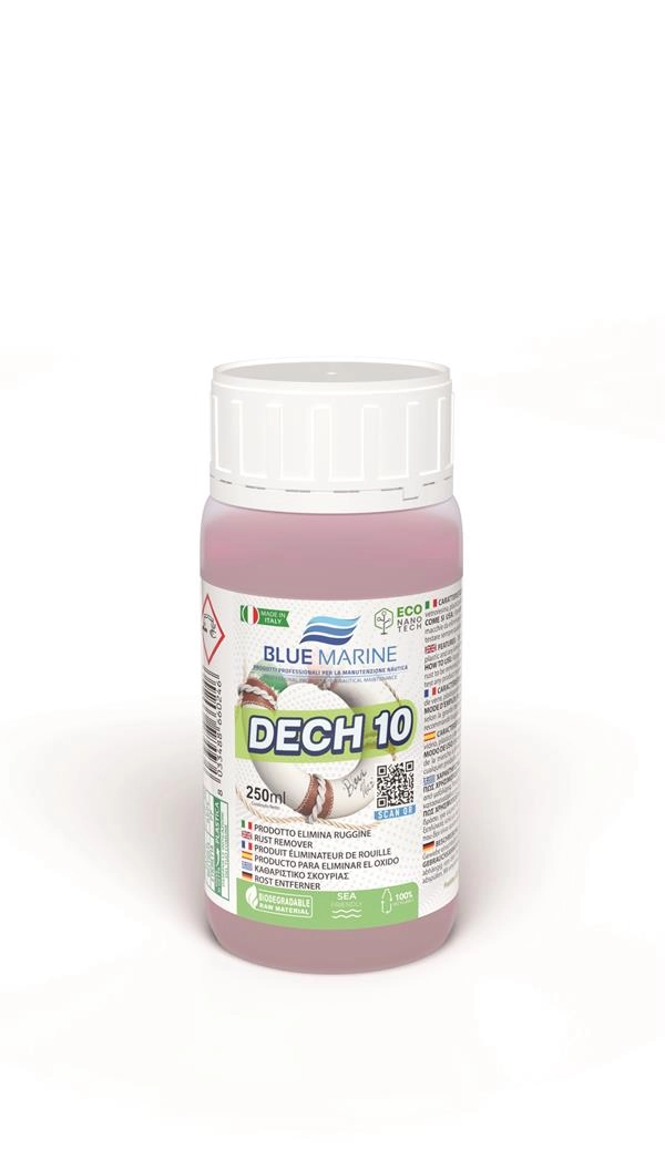 Slightly acid product that quickly removes rust from cushions, sky, fibreglass, plastic; suitable for inflatable boats made of either PVC or neoprene.