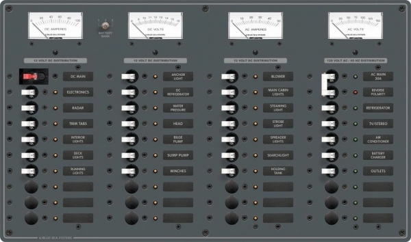 Blue Sea Systems Sigorta paneli. 8 AC, 29 DC pozisyonlu. 12V DC/230V AC. 292x495mm. 30 adet AC, 30 adet DC etiket.