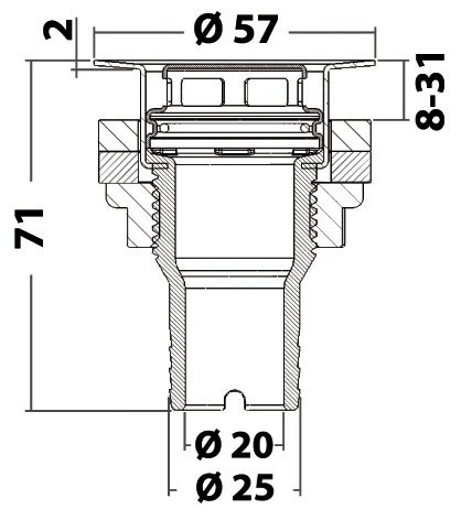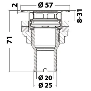 Paslanmaz çelik kafalı gömme su gideri.  Güçlendirilmiş asetal fiberden yapılmış gövde. AISI 316 paslanmaz çelik kafa ve çıkarılabilir filtre. Hortum Ø 25 mm.