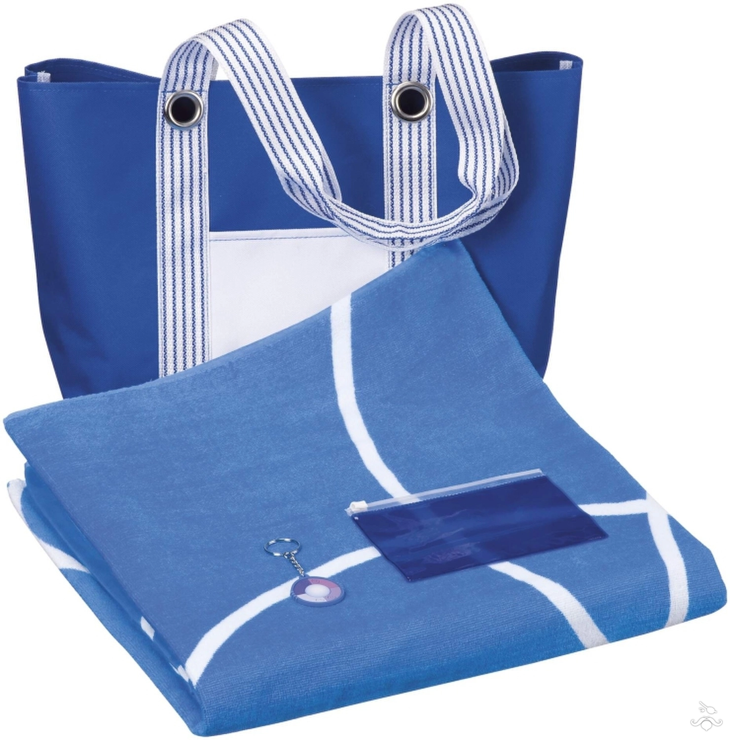 Plaj çantası, büyük bir havlu ve UV anahtarlıktan oluşan set