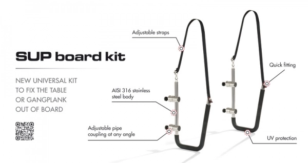 Kürek sörfü veya pasarella tutucu kit Bu kit, kürek sörfü veya pasarellayı dışarı sabitlemek için kullanılır. 360° ayarlanabilir paslanmaz çelik kelepçeler vasıtasıyla vardavelaya monte edilir. Hızlı serbest bırakma düğmesi, kullanılmadığında her bir kolun hemen döndürülmesine veya daha dar kürek sörfleri veya pasarellalar olması durumunda daha küçük bir açıya ayarlanabilir. Her kol, köpük PVC sürtünme korumalarının yanı sıra ayarlanabilir ve çıkarılabilir kayışlarla donatılmıştır.