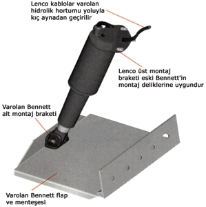Lenco terfi kiti. Lenco terfi kiti. Eskimiş, sorunlu hidrolik Bennett flap sistemini kolayca ve minimum maliyet ile modern, yüksek teknolojili Lenco´ya terfi ettirmenizi sağlar. Standart boyda Bennett silindirler (A110A) takılı olan tüm teknelere uygulanabilir. Kit içeriğinde yeni delik, dolgu gerektirmeden Lenco´yu uygulamanız için her şey mevcuttur. Bennett hidrolik pompa ve silindirler çıkartılır. Bennett´e uygun üst montaj braketine sahip Lenco silindirler takılır. Mevcut Bennett kablo yoluyla panele bağlantı yapıldığında montaj tamamlanmıştır. Kit içeriği bir çift Lenco silindir ve üst montaj braketinden oluşmaktadır.