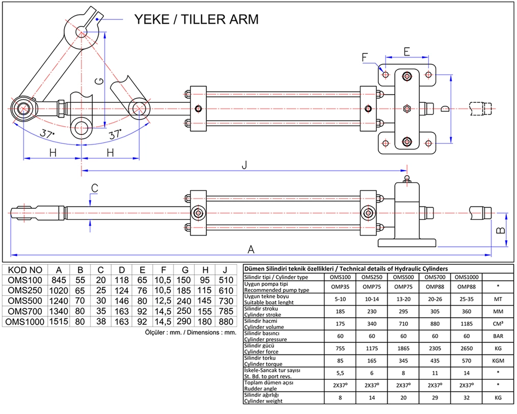 5 mt ile 40mt arasındaki tekneler için 5 farklı değerdedir.Silindir borusu mikro honlanmış ST52 çelik,Silindir mili sert krom kaplı CK45 çelik’tir. CE normlarında imal edilmektedir.