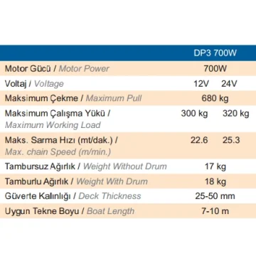 Deniz koşullarına tamamen uyumlu AISI 316 paslanmaz çelik, alüminyum, kromaj ve kompozit malzemelerden mamuldür. Üstün kalitesi ve mükemmel dizaynı ile uzun süre servis gereksinimi duymayacak şekilde tasarlanmıştır. CE onaylıdır. Opsiyonel zincir sayacı bağlantısı için gerekli sensör ırgat üzerine standart olarak monte edilmiştir. Solenoid ve vinç kolu standart ekipmanlardır.