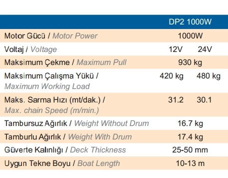 Deniz koşullarına tamamen uyumlu AISI 316 paslanmaz çelik, alüminyum, kromaj ve kompozit malzemelerden mamuldür. Üstün kalitesi ve mükemmel dizaynı ile uzun süre servis gereksinimi duymayacak şekilde tasarlanmıştır. CE onaylıdır. Opsiyonel zincir sayacı bağlantısı için gerekli sensör ırgat üzerine standart olarak monte edilmiştir. Solenoid ve vinç kolu standart ekipmanlardır.