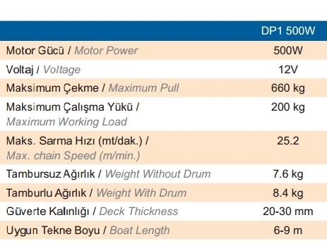 Deniz koşullarına tamamen uyumlu AISI 316 paslanmaz çelik, alüminyum, kromaj ve kompozit malzemelerden mamuldür. Üstün kalitesi ve mükemmel dizaynı ile uzun süre servis gereksinimi duymayacak şekilde tasarlanmıştır. CE onaylıdır. Solenoid ve vinç kolu standart ekipmanlardır.