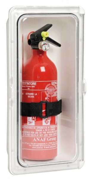 Şeffaf kapaklı yangın söndürücü yuvası.