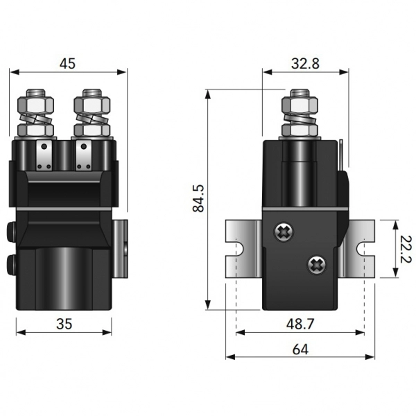 Bu solenoid, 12V voltaj ile çalışır ve 1800 Watt'a kadar maksimum güç sağlar. IP66 koruma sınıfına sahiptir ve maksimum kontakt voltajı 48V DC'dir.
