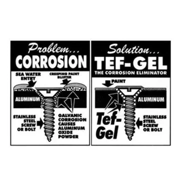 Ultra Tef-Gel®, tuzlu su elektrolitlerinin bağlantı metallerinin yüzeyine çıkmasını önleyerek teknelerdeki farklı metaller arasındaki korozyonu yağlar ve ortadan kaldırır. Tef-Gel® uçucu solventler içermez, buharlaşmaz, kurumaz veya yıkanmaz, uzun süreli koruma sağlar ve yıllar sonra kolayca sökülebilir.