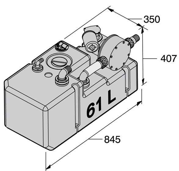Sistem 12V bir adet pis su pompası, bakım kapağı, ultrasonik seviye şamandırası, Ø 38mm açılı çıkış, Ø 16mm açılı havalandırma çıkışından oluşur. Açılı pis su dolum dirsekleri ayrıca sipariş edilmelidir.