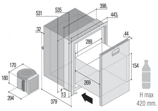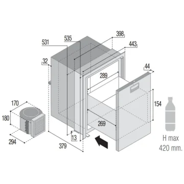 12/24V DC. Çekmeceli Model. Paslanmaz çelik kapı ve çerçeveli. Kompresör ünitesi dolabın 1,5 metre uzağına kadar konabilir.