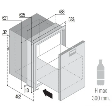 12/24V DC. Çekmeceli Model.  Paslanmaz çelik kapı ve çerçeveli. Kompresör ünitesi dolabın 1,5 metre uzağına kadar konabilir.