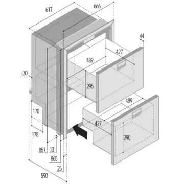 DW180 DTX. Paslanmaz çelik gövdeli. Vitrifrigo Buzdolabı/dondurucu. DW180 OCX2 DTX. Çekmeceli tip. Paslanmaz çelik kapak ve çerçeveli. Alt gözü buzdolabı, üst gözü ise derin dondurucudur.