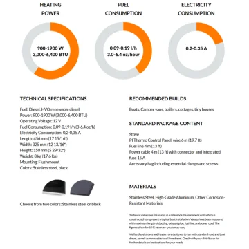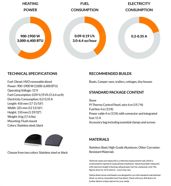 900W ve 1900W olmak üzere iki gözlü düz tasarım 85DT diesel ocak alüminyum kenarlara sahiptir ve yüzeyden sadece 2mm çıkıntısı bulunur. 5044070B kodlu Wallas 270 ısı dağıtıcı kapak ile aynı zamanda ısıtıcı olarak kullanılabilir. 12V.